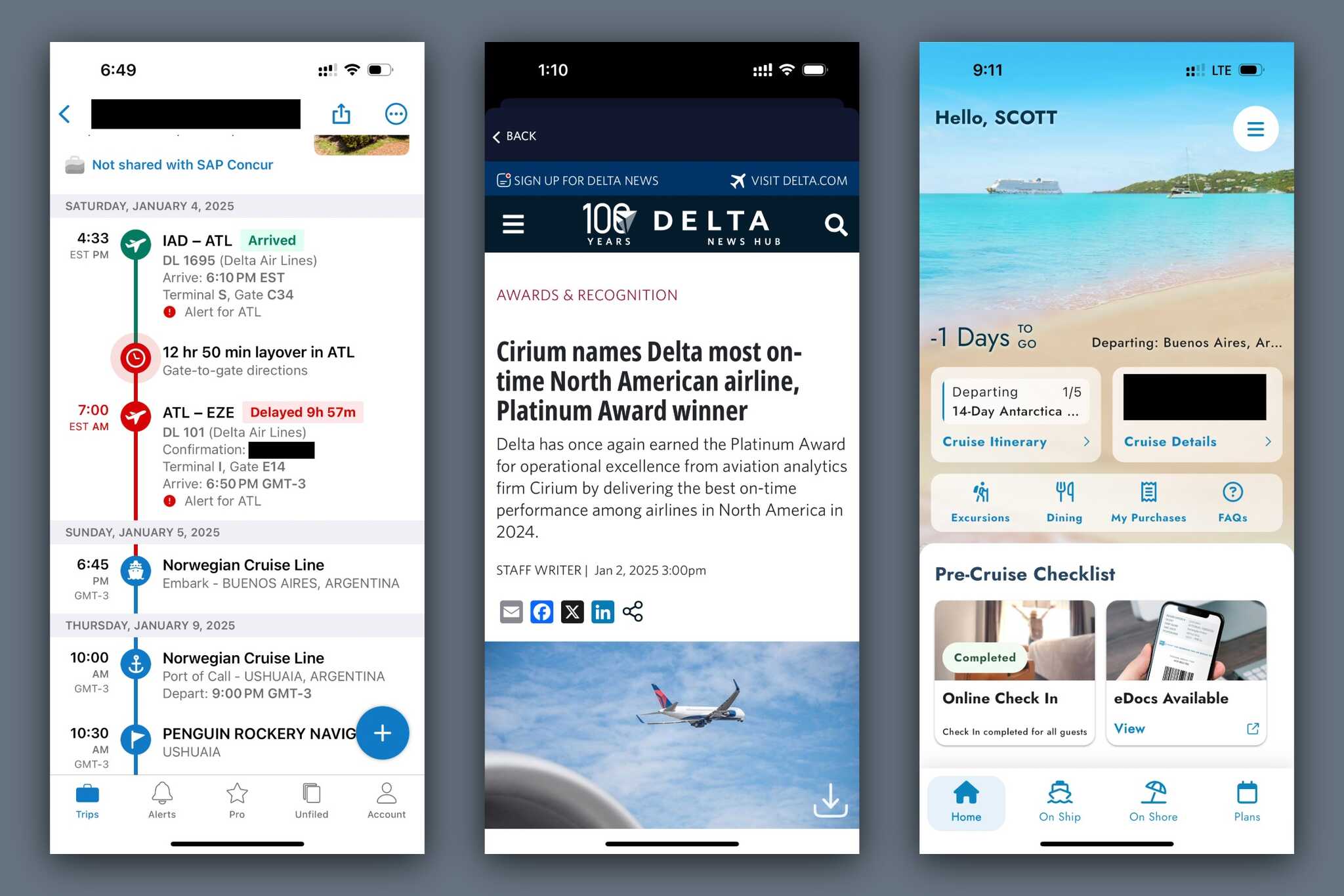 Delta scheduled an impossible flight—the plane was scheduled by the airline to depart Las Vegas for Atlanta about an hour before it was scheduled to leave Atlanta for Buenos Aires. That was never going to happen. There were no alternatives available to get us to Buenos Aires before the ship departed . . . so we missed it.